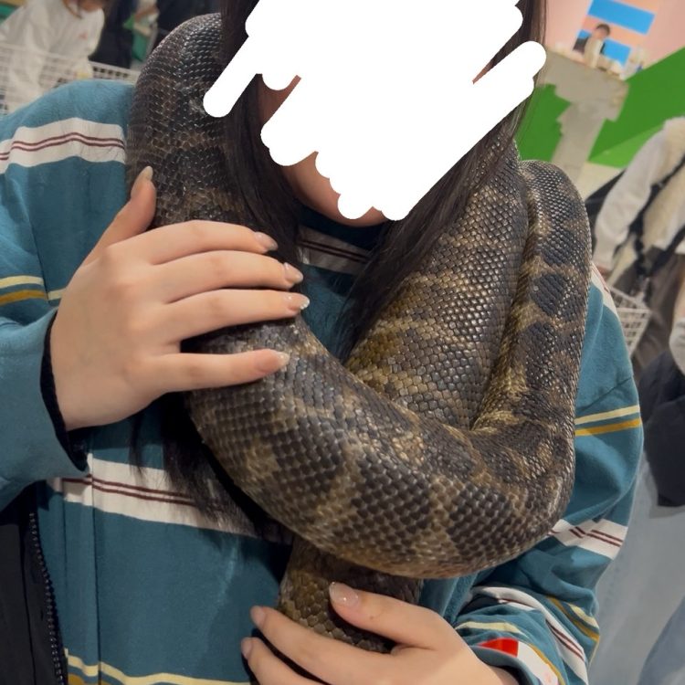 先週は蛇を首に巻きました…蛇の顔ってかわいいですよね。なぜか私の時だけしっかりと巻き付いてきてます。これも徐々に絞められています。気に入られたのか食べようとしているのか…