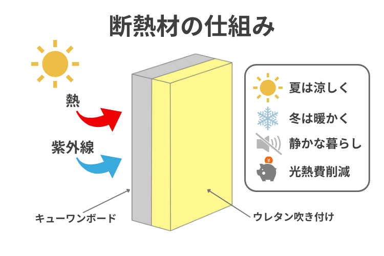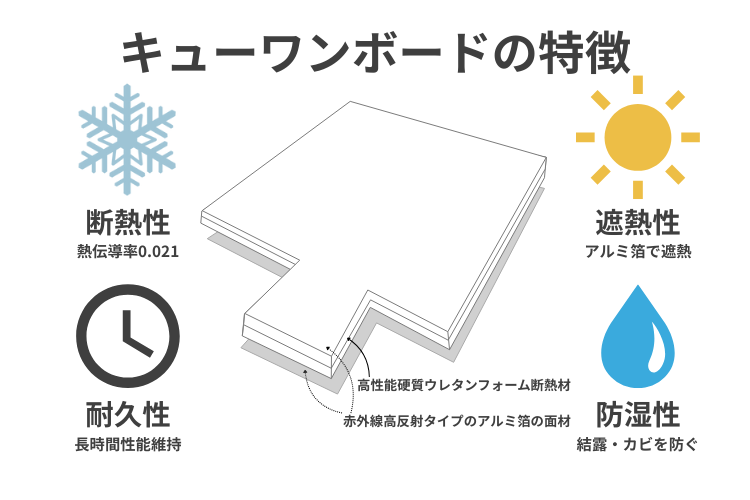 高性能硬質ウレタンフォームを使用し、熱伝導率0.021W/(m・K)という非常に優れた断熱性能を実現。