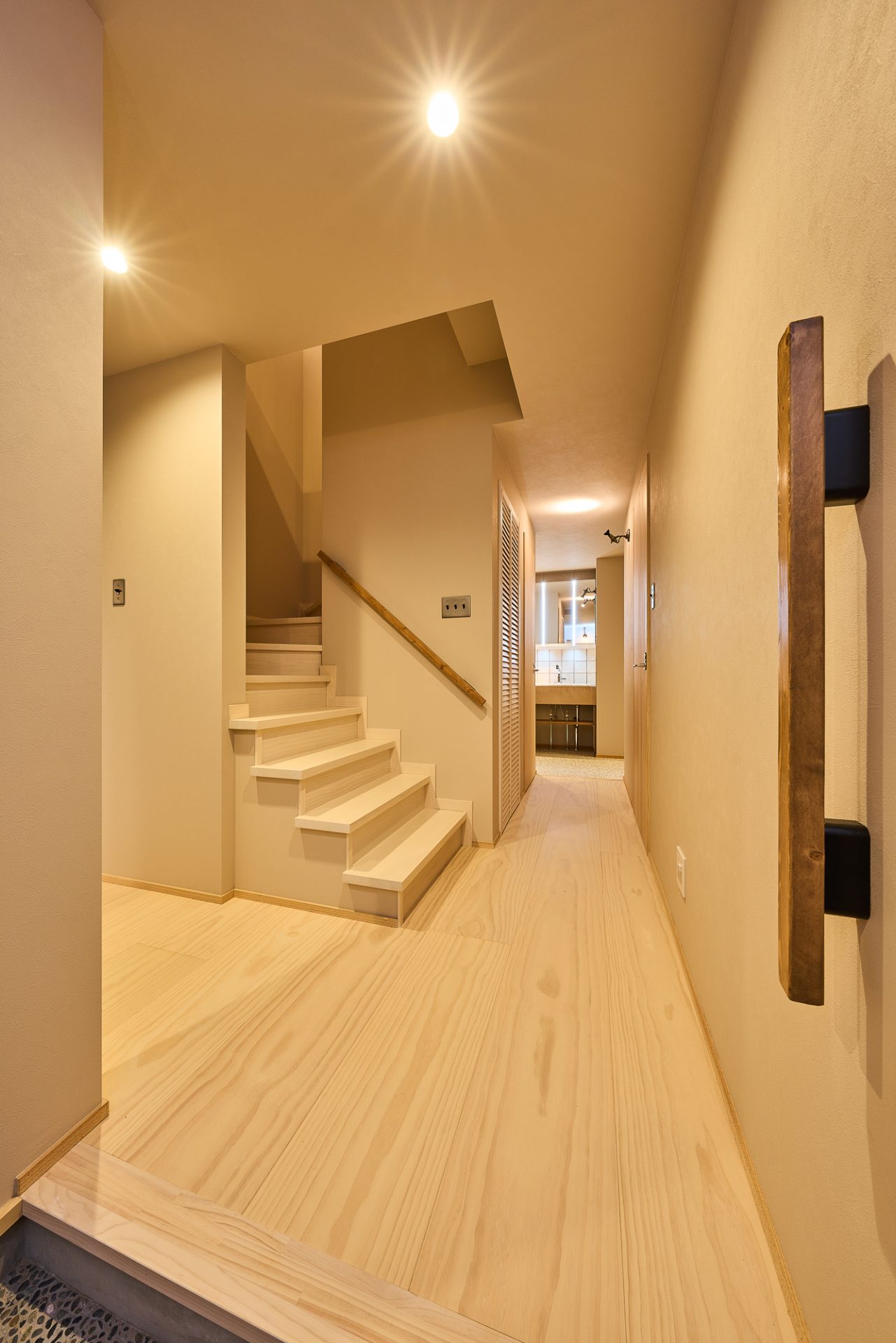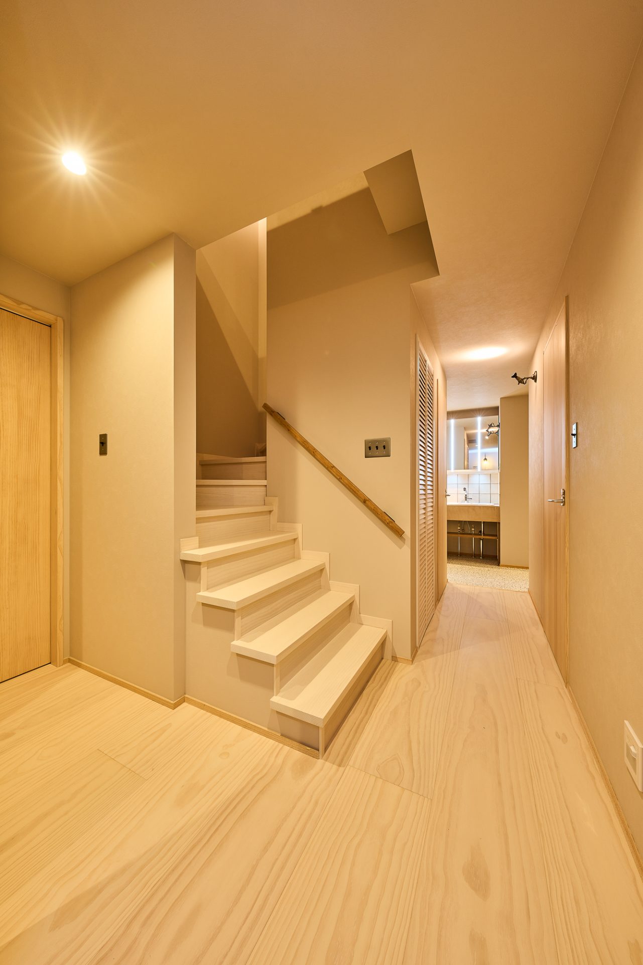 階段の段数を一段増やして、通常より一段あたり2センチ下げて上りやすさを意識。足が不自由な親世帯も安心