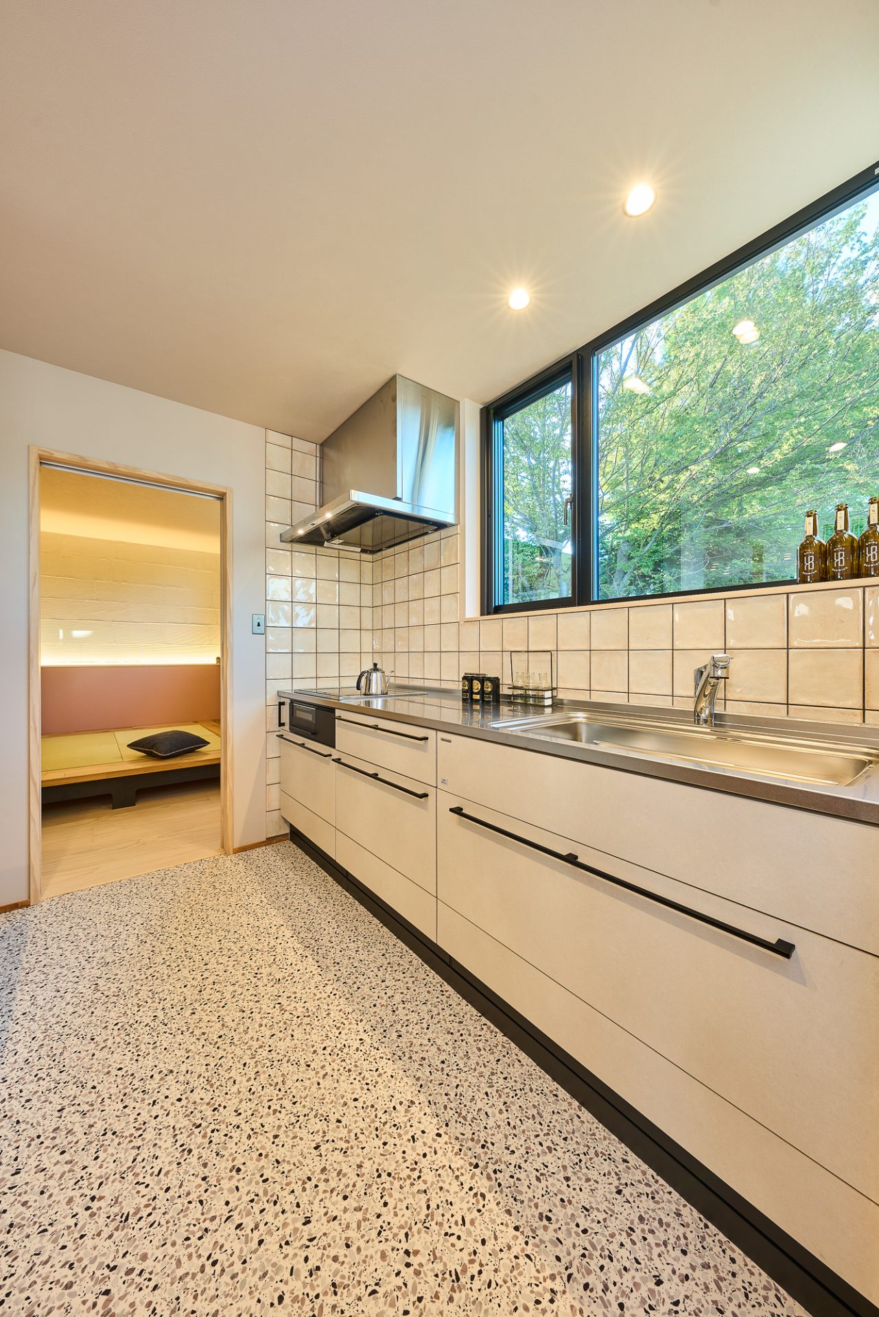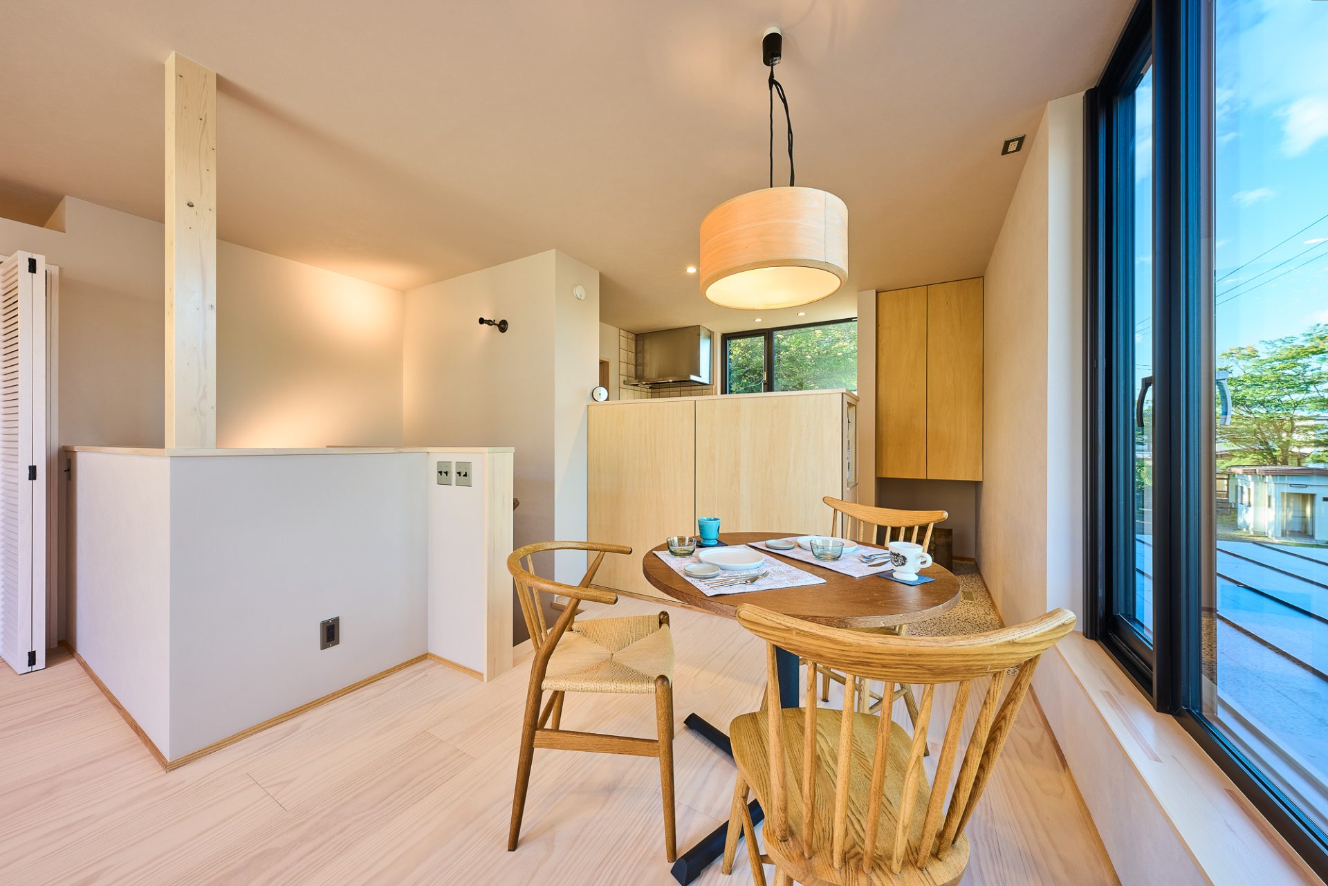 解放感溢れる大きな窓。キッチンの先には...