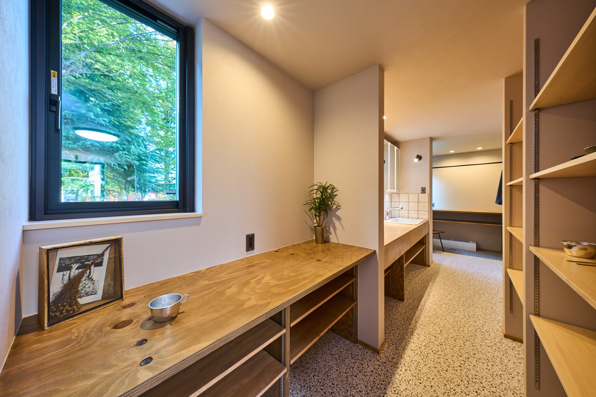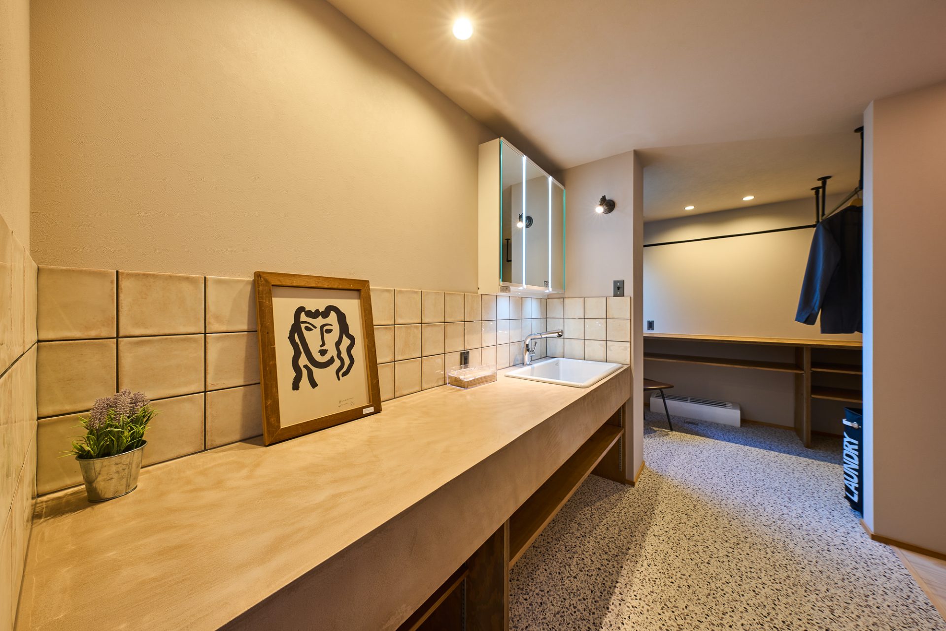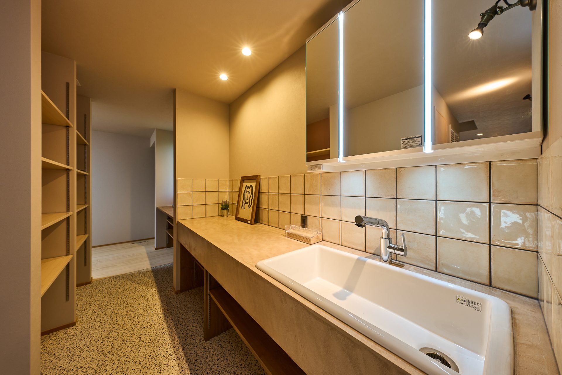 親世帯の部屋から直通できる洗面室。ミニキッチンとしても使える、大型の洗面台を設置