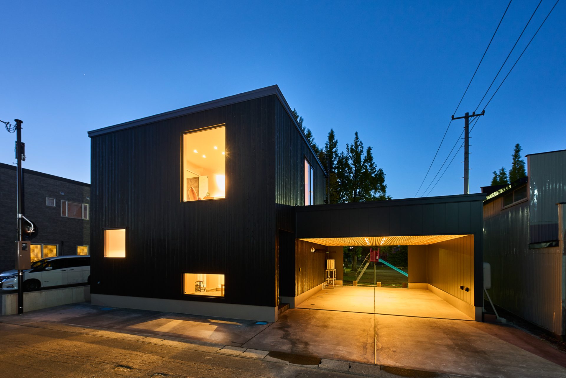 雪かき不要のガレージ。光が灯ると幻想的なガレージへ